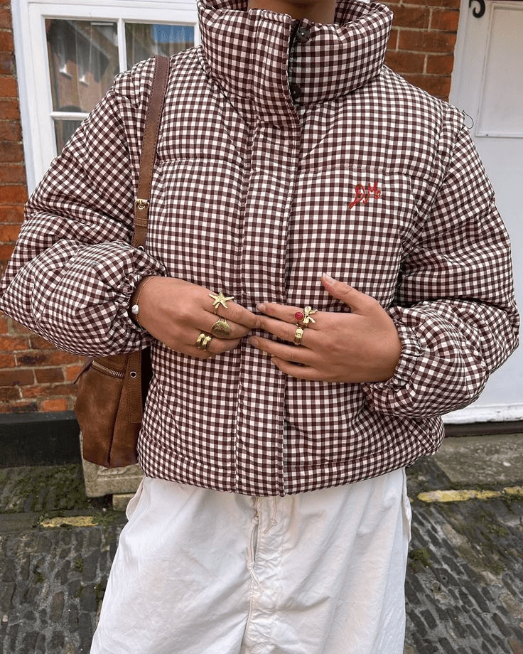 - Jennifer Check Puffer in chocolate gingham from Damson Madder